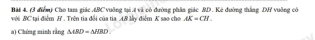 Bài 4. (3 điểm) Cho tam giác ABC vuông tại 4 và có đường phân giác BD. Kẻ đường thẳng DH vuông có với BC tại điểm H . Trên tia đối của tia AB 1 điểm K sao cho AK=CH.