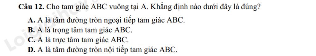 Câu `12`. Cho tam giác `ABC` vuông tại `A`. Khẳng định nào dưới đây là đúng?