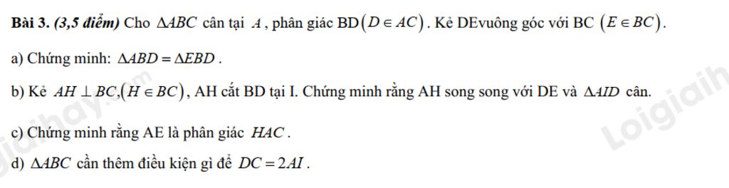 Bài 3. (3,5 điểm) Cho A4BC cân tại 4, phân giác BD(D = AC). Kẻ DEvuông góc với BC (E = BC).