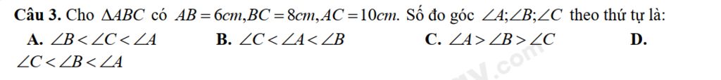 Câu 3. Cho $\triangle$ ABC có AB=6cm,BC=8cm,AC=10cm. Số đo góc A;B;C theo thứ tự là: