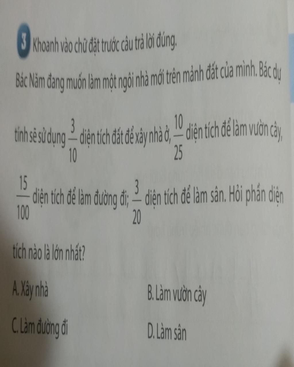 Diện tích làm sân là `3/20 = (3 xx 5)/(20 xx 5) = 15/100`