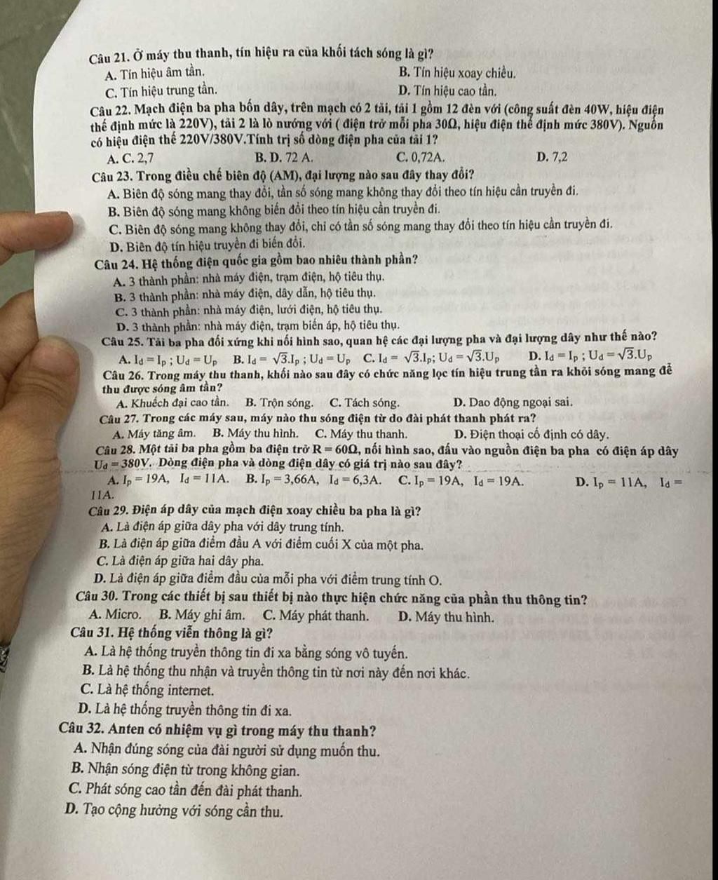 Câu 21. Ở máy thu thanh, tín hiệu ra của khối tách sóng là giữ