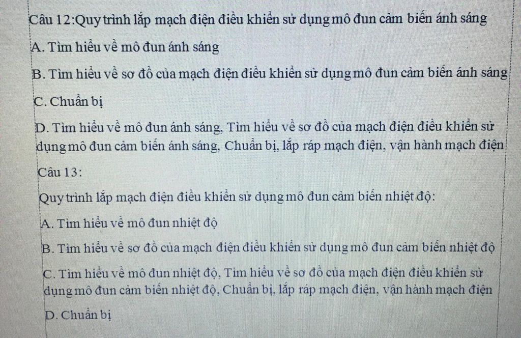 Câu 12:Quy trình lắp mạch điện điều khiển sử dụng mô đun cảm biến ánh sáng