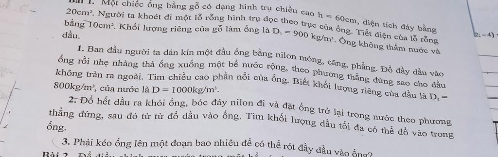 bằng 10cm. Khối lượng riêng của gỗ làm ống là D = 900 kg/m. Ông không thấm nước và