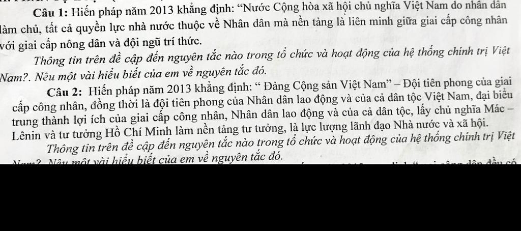 - Thông tin trên đề cập đến nguyên tắc trong tổ chức và hoạt động của hệ thống chính trị Việt Nam : Nguyên tắc đảm bảo sự lãnh đạo của Đảng Cộng sản Việt Nam