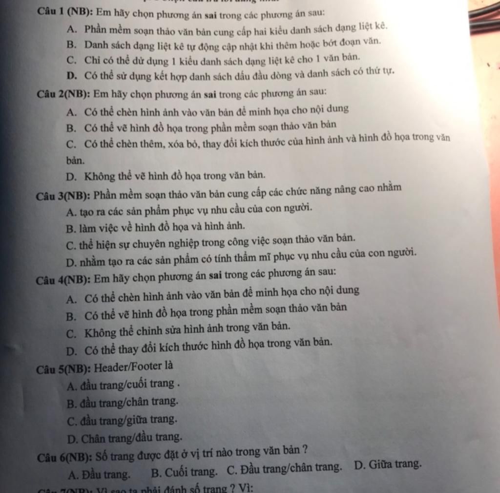 Câu 1 (NB): Em hãy chọn phương án sai trong các phương án sau: