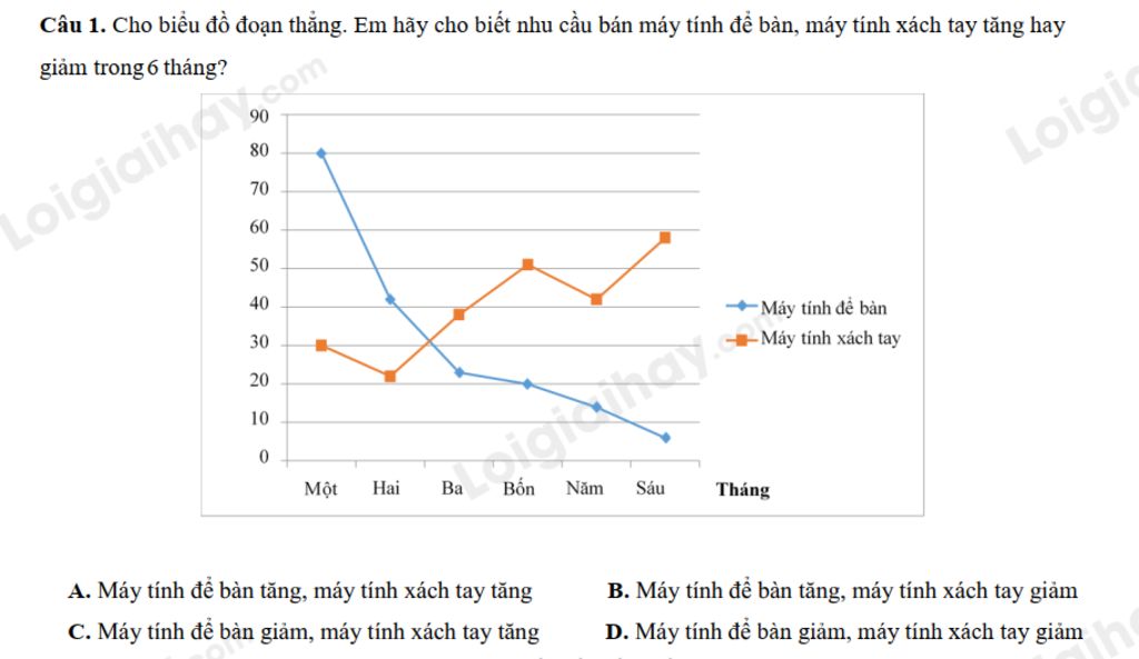 `@` Nhìn biểu đồ ta thấy: trong `6` tháng, máy tính để bàn tăng, máy tính xách tay giảm