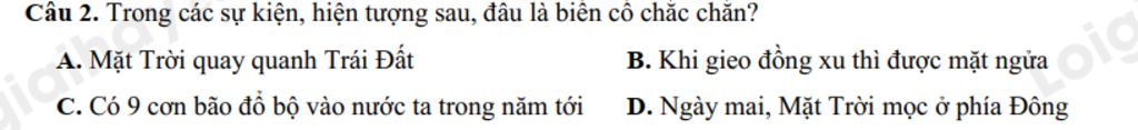 `D.` Là biến cố chắc chắn vì chắc chắn Mặt Trời mọc ở phía Đông