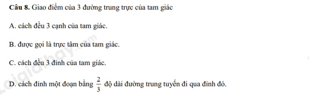 `@` Định lí `3` đường trung trực: Ba đường trung trực của `1` tam giác đồng quy tại `1` điểm. Điểm này cách đều `3` đỉnh của tam giác.