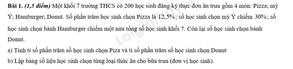 - Tỉ số phần trăm số học sinh chọn Donut là `100% - (12,5% + 30% + 50%) = 7,5%`