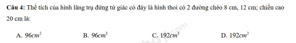 Câu 4: Thể tích của hình lăng trụ đứng tứ giác có đáy là hình thoi có 2 đường chéo 8 cm, 12 cm; chiều cao
