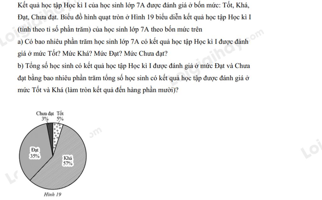 b) Tổng số học sinh có kết quả học tập Học kì I được đánh giả ở mức Đạt và Chưa đạt bằng phần trăm tổng số học sinh có kết quả ở mức Tốt và Khá là: `(35% + 3%)/(5% + 57%) = 19/31 ≈ 0,7 %`