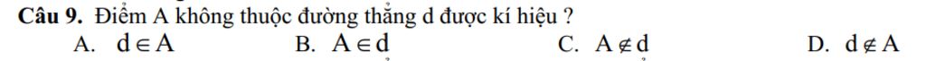 `=>` Điểm `A` không thuộc đường thẳng `d` được kí hiệu là `A notin d`