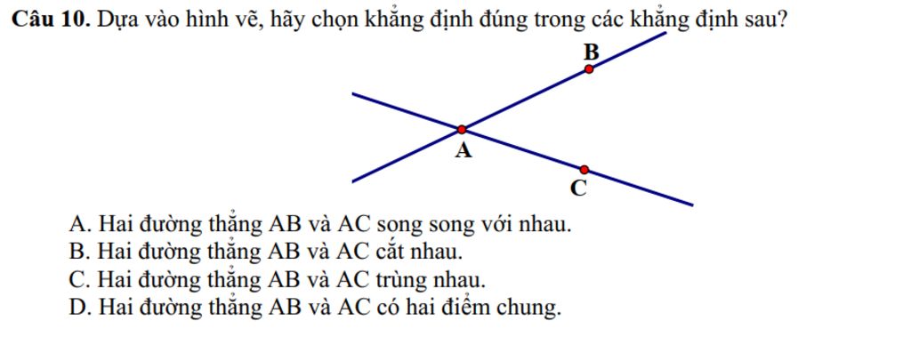 `B.` Đúng vì `AB` và `AC` cắt nhau tại `A`