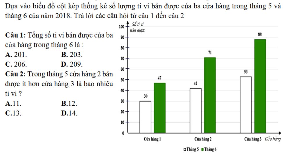 `->` Trong tháng `5` cửa hàng `2` bán được ít hơn cửa hàng `3` là: