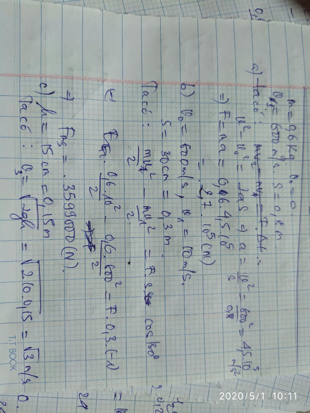 \({\rm{W}} = \dfrac{1}{2}m{v^2} = \dfrac{1}{2}.0,{05.600^2} = 108000J\)