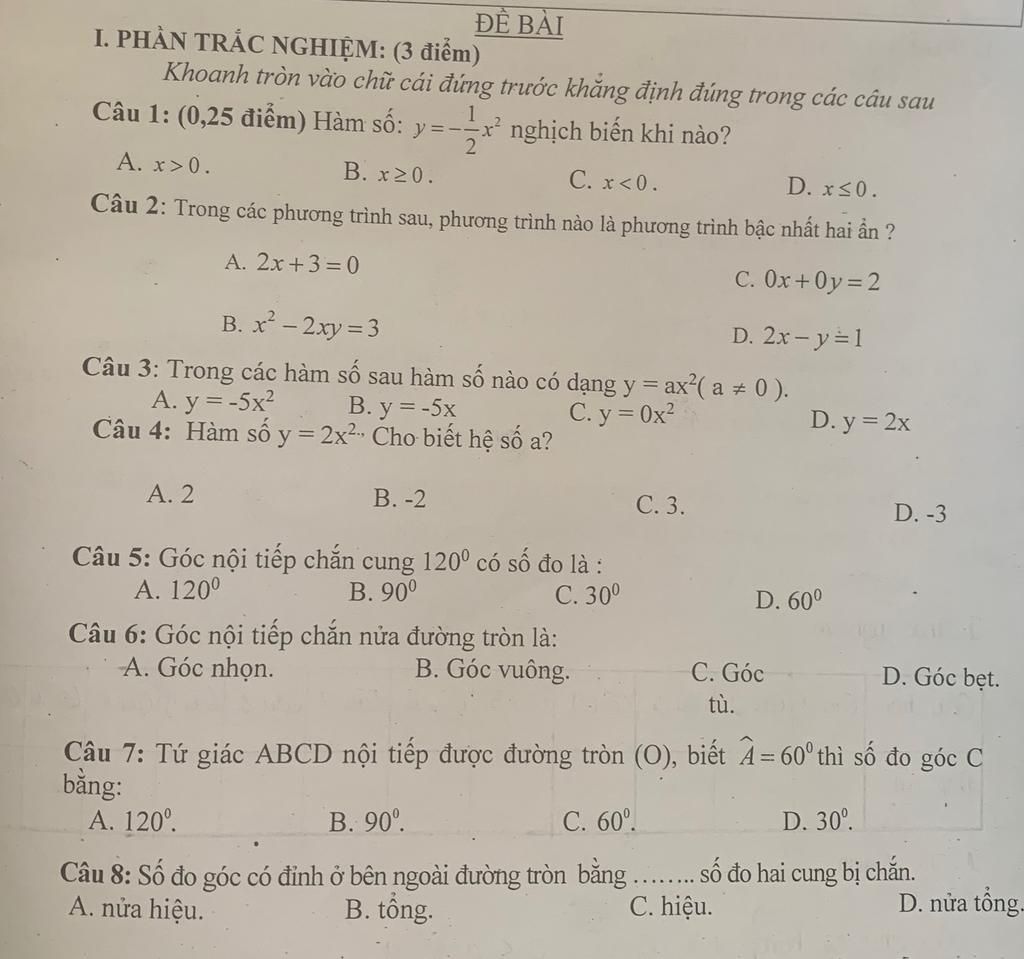 Hàm số `y=-1/2x^2` có `a=-1/2<0` nên hàm số đồng biến khi `x<0` và nghịch biến khi `x>0`.