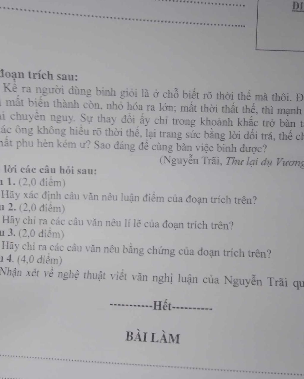 `4.` Nhận xét nghệ thuật văn nghị luận của Nguyễn Trãi:T ác giả sử dụng các lí lẽ sắc bén, hùng hồn để thuyết phục người đọc kết hợp với giọng điệuvừa cương quyết, đanh thép, vừa mềm dẻo, thể hiện sự kết hợp hài hòa giữa lý và tình.