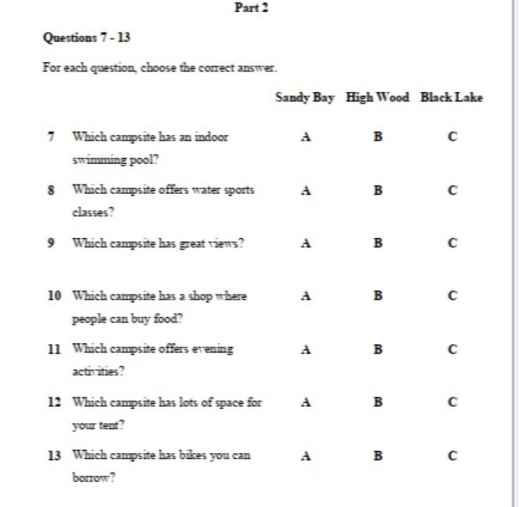 Three great campsites to try this summerSandy BayThis campsite is on an excellent beach, and has its own surfing school with special prices for campers. You can also learn to windsurf and sail there. The sea is safe for swimming, so it’s a great place for families. The large swimming pool is great in summer, and has a wide area of grass around it. Its small supermarket has long opening hours. It doesn’t matter what size tent you bring, as the campsite is large and you won’t be too near your neighbours!High WoodThere are lots of activities you can do at High Wood campsite, from fishing to cycling, and they’ll lend you any of the equipment you need. It’s not as large as some campsites, but it’s clean and modern. It has a fantastic pool with a roof window which can open and close.There’s also a special area where you can watch films or dance under the stars to local bands. For food shopping, try the shop in the nearby village.Black LakeThe wonderful thing about Black Lake campsite is waking up in the morning and seeing the beautiful mountains all around you. You don’t have to bring your own tent - there are some already there you can pay to use. There’s lots to do - you can swim in the lake or walk in the forest. And don’t forget to bring your mountain bike with you! If you want to cook for yourself, the shop in the next village has a good variety of food.