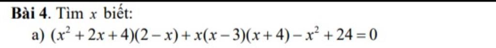 `a, (x^2 + 2x + 4)(2 -x) + x(x - 3)(x + 4) -x^2 + 24= 0`