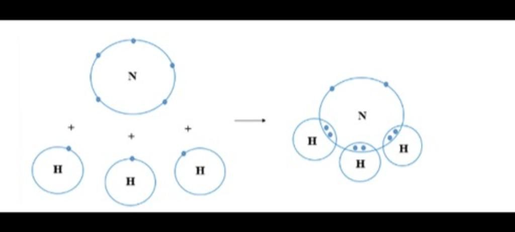 + Khi N kết hợp với H, nguyên tử N góp 3 electron, mỗi nguyên tử H góp 1 electron. Như vậy giữa nguyên tử N và H có một đôi electron dùng chung