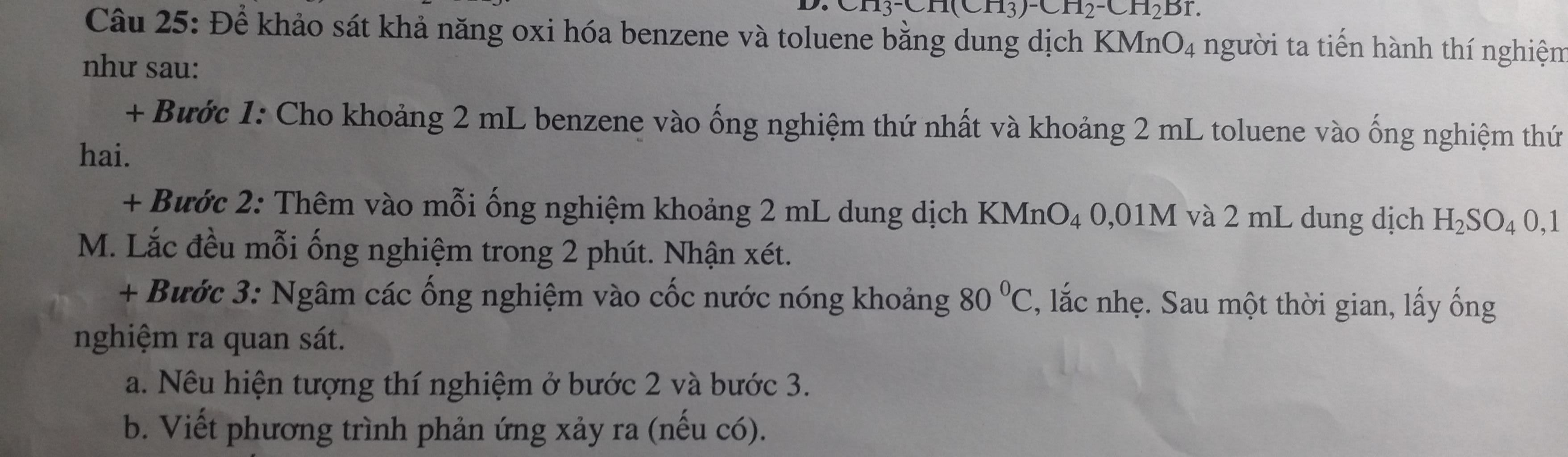 `-` Ống nghẹm thứ nhất tách lớp rõ ràng với lớp trên là tướng hữu cơ $toluen$ và pha nước phía dưới có màu hồng gồm $H_2SO_4(dung \,\, dịch),KMnO_4.$