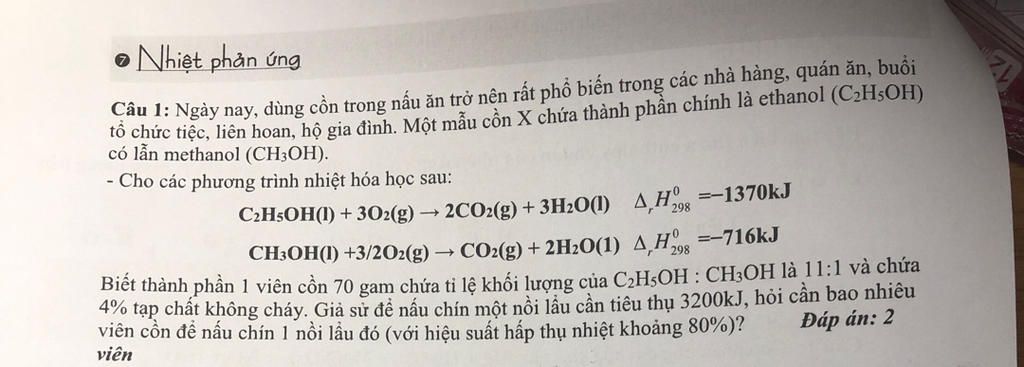 Lượng nhiệt tỏa ra khi đốt 1 viên cồn: