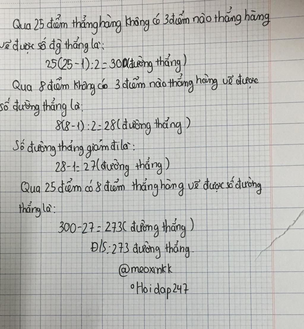 Lấy `1` điểm nối với `24` điểm còn lại thì được `24` đường thẳng ,mà có `25` điểm ,nhưng mỗi đường thẳng được tính 2` lần nên số đường thẳng là: