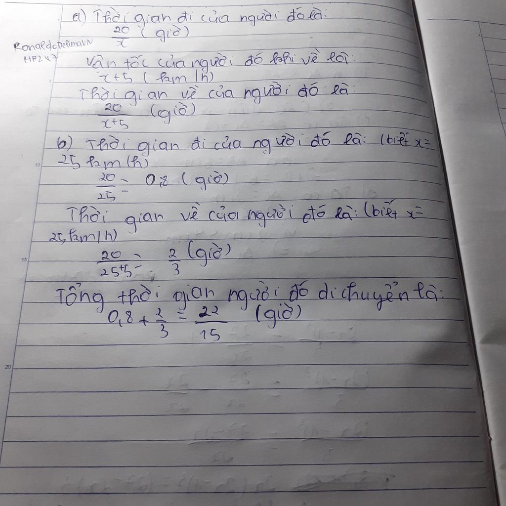 $$\dfrac{20}x+\dfrac{20}{x+5}(giờ)$$