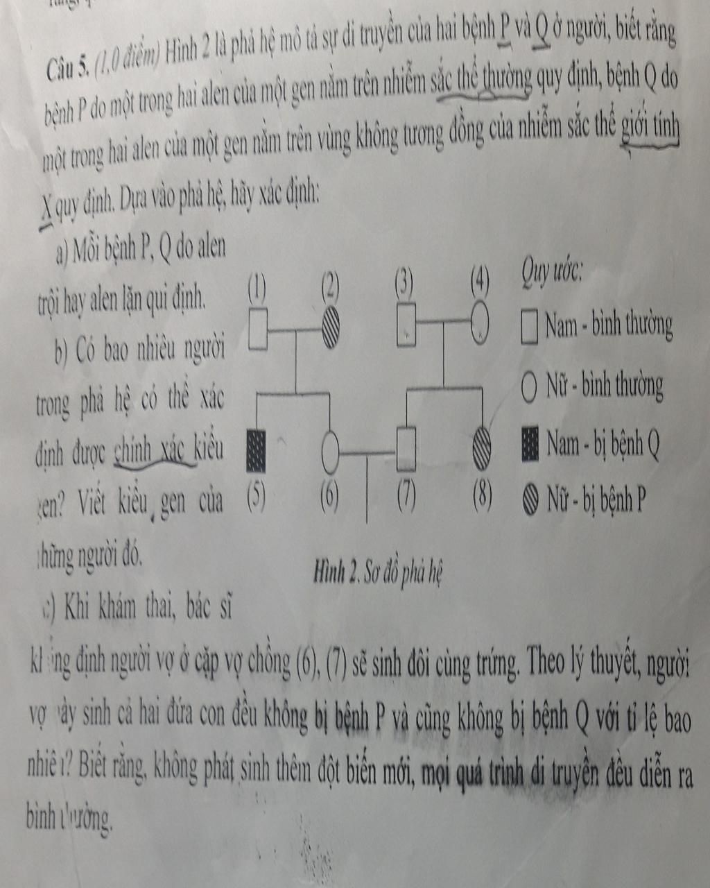 Câu 5. (1.0 điểm) Hình 2 là phủ hệ mô tả sự di truyền của hai bệnh P và Q ở người, biết