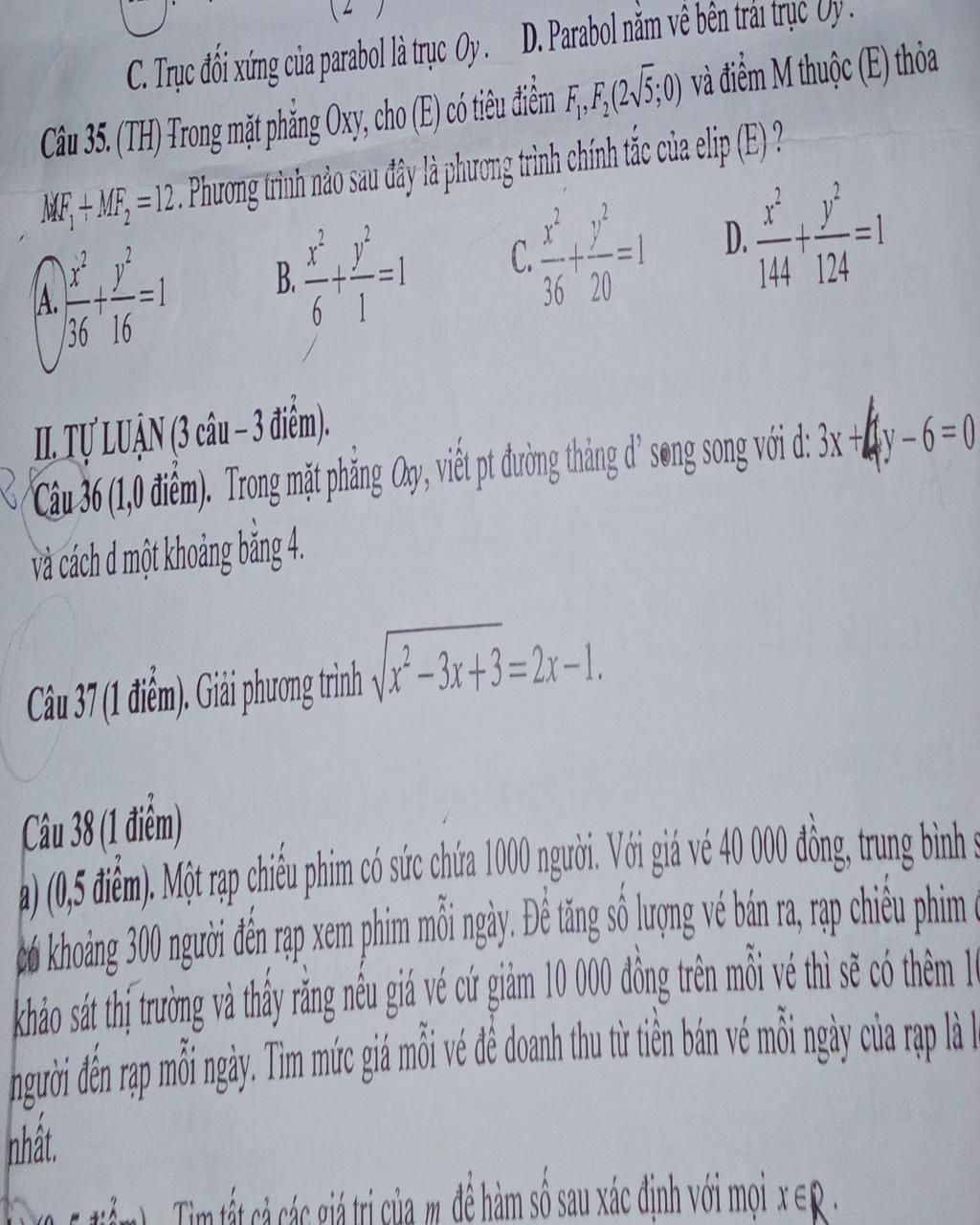 Câu 35. (TH) Trong mặt phẳng Oxy, cho (E) có tiêu điểm F,F,(2V5;0) và điểm M thuộc (E) thỏa