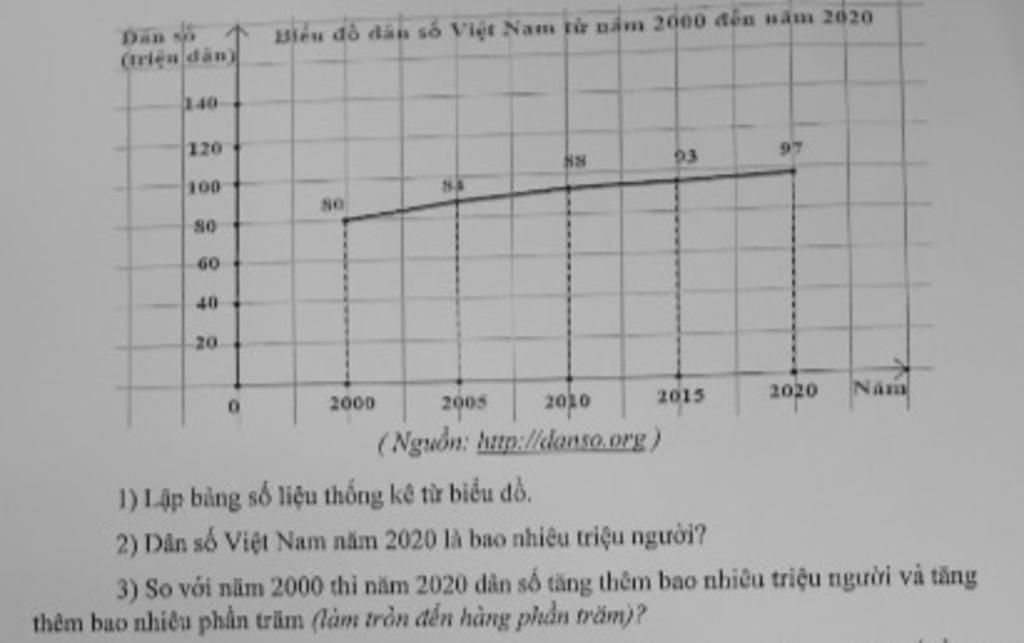`bb1)`\begin{array}{|c|c|c|}\hline \text{Năm}&\text{Dân số (triệu người)}\\\hline \text{2000}&\text{80}\\\hline \text{2005}&\text{84}\\\hline \text{2010}&\text{84}\\\hline \text{2015}&\text{93}\\\hline \text{2020}&\text{97}\\\hline\end{array}$\\$ $\,\,\,\,\,\,\,\,\,\,\,\,\,\,\,\,\,$Bảng thống kê dân số Việt Nam$\\$ từ năm `2000` đến năm `2020` (đơn vị: triệu người).$\\$`bb{2))` Dân số Việt Nam năm `2020` là `97` triệu người.$\\$`bb3)`$\\$ `@` So với năm `2000` thì năm `2020` dân số tăng: `97-80=17` (triệu người)$\\$ `@` So năm `2000` thì năm `2020` dân số tăng: `80/97xx100=82,47` (đã làm tròn đến hàng phần trăm)
