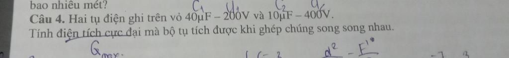 Vì `U_1 = 200 (V) < U_2 = 400 (V)` nên hiệu điện thế cực đại có thế đặt vào hai đầu bộ tụ là `U_[max] = U_1 = 200 (V)`