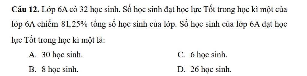 Câu 12. Lớp 6A có 32 học sinh. Số học sinh đạt học lực Tốt trong học kì một của lớp 6A chiếm 81,25% tổng số học sinh của lớp. Số học sinh của lớp 6A đạt học lực Tốt trong học kì một là: