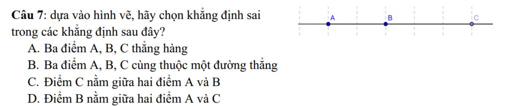 `->` Điểm `C` nằm giữa hai điểm `A` và `B.` `=>` Sai.