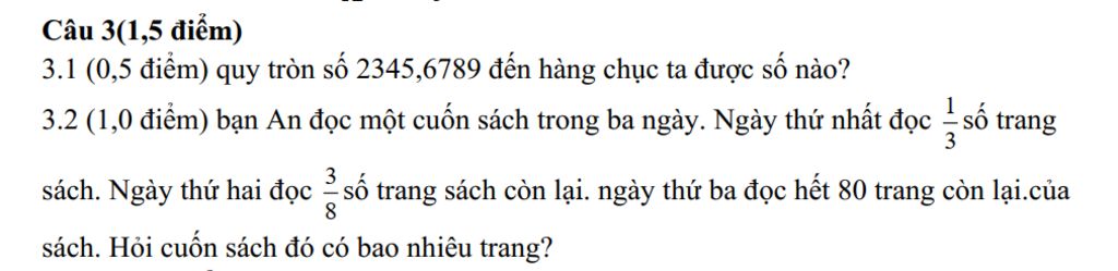 3.2 (1,0 điểm) bạn An đọc một cuốn sách trong ba ngày. Ngày thứ nhất đọc $\frac{1}{3}$ số trang sách. Ngày thứ hai đọc $\frac{3}{8}$ số trang sách còn lại. ngày thứ ba đọc hết 80 trang còn lại của sách. Hỏi cuốn sách đó có bao nhiêu trang?