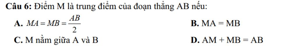 `@` `M` là trung điểm của `AB` khi `MA=MB=AB/2`