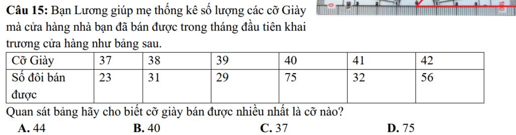 `=>` Chọn `B.40` (Chú ý đề: Đề hỏi cỡ giày chứ không phải đôi giày đã bán.)