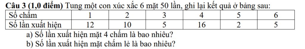 Câu `3 (1,0` điểm) Tung một con xúc xắc `6` mặt `50` lần, ghi lại kết quả ở bảng sau:
