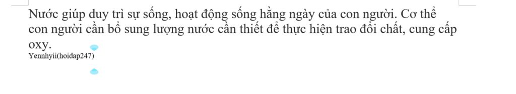 -Nước giúp duy trì sự sống, hoạt động sống hằng ngày của con người. Cơ thể con người cần bổ sung lượng nước cần thiết để thực hiện trao đổi chất, cung cấp oxy. Bên cạnh sức khỏe, nước còn là nguồn cung thiết yếu trong sinh hoạt cũng như những hoạt động sản xuất công nghiệp, nông nghiệp, y tế và tạo ra năng lượng điện.