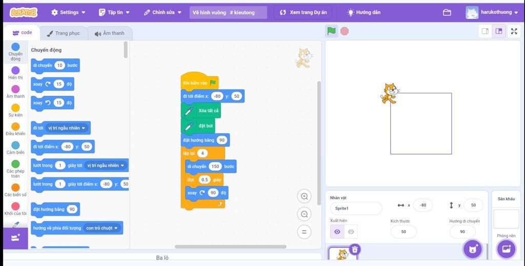 Câu 30:Em hãy mô tả thuật toán điều khiển nhân vật đi theo đường là một hình vuông có độ dài cạnh là 150(bước)?