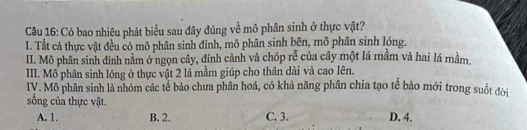 II. Mô phân sinh đỉnh nằm ở ngọn cây, đỉnh cành và chóp rễ của cây một lá mầm và hai lá mầm.⇒ Đúng.