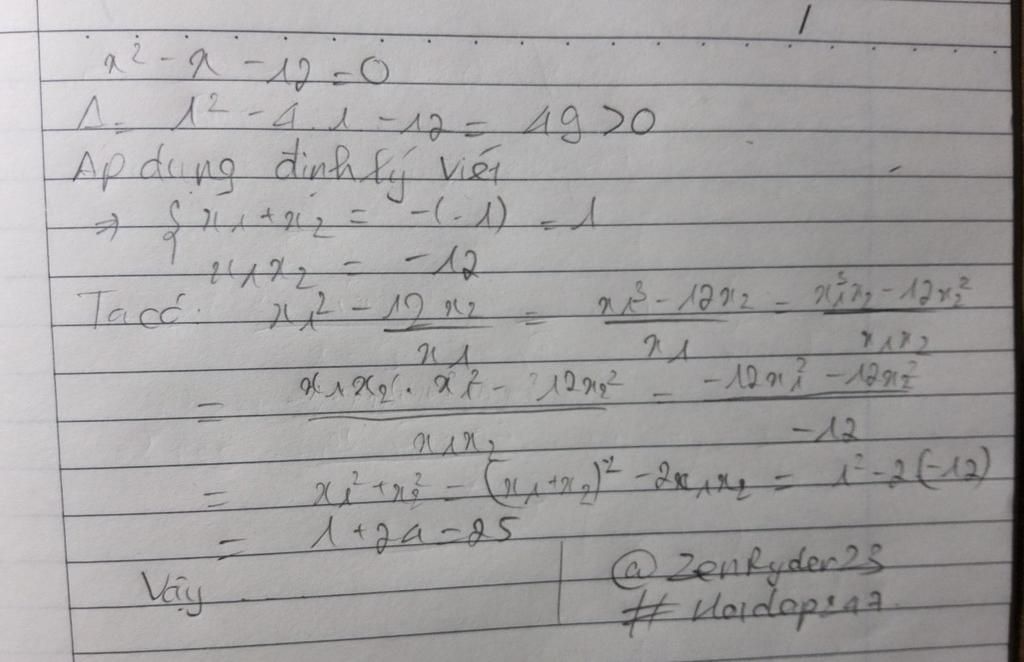 Gọi x1, x2 là các nghiệm của phương trình: x^2-x-12=0 .Không giải phương trình, hãy tính giá trị của biểu thức: M=x1^2-12x2/x1