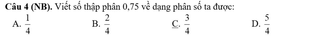 Số thập phân `0,75` được viết dưới dạng phân số như sau: