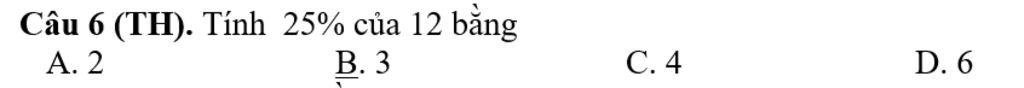 `12 xx 25% = (12 xx 25)/100 = 300/100 = 3.`