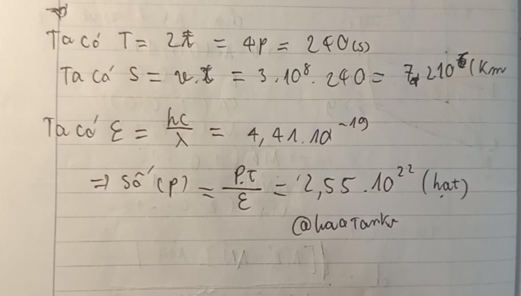Câu 16: Người ta dùng một Laze hoạt động dưới chế độ xung để đo khoảng cách từ Trái đất đến Kim tinh. Laze có bước sóng 0.45µm và thời gia kéo dài của một xung là 15µs. Công suất của chùm Laze là 7,5.108W. Thời gian từ lúc phát xung đến lúc nhận xung phản xạ là 8 phút. Khoảng cách từ Trái đất đên Kim tinh tại thời điểm đo và số phôtôn chứa trong một xung là.