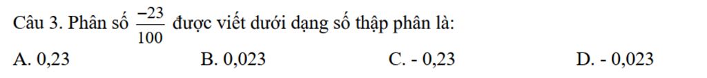 Phân số `\frac{-23}{100}` được viết dưới dạng số thập phân là: