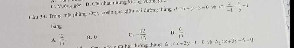Câu 33: Trong mặt phẳng Oxy, cosin góc giữa hai đường thẳng d:5x+y−3=0 và d:=