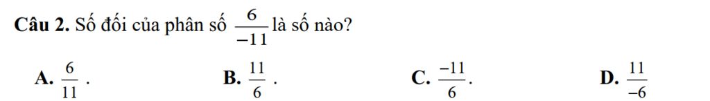`=>` Với phân số `6/-11` trên, đó là phân số âm thì số đối của nó sẽ là một phân số dương.