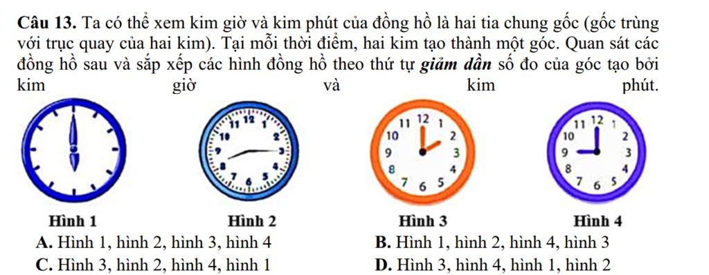 `=>` Sắp xếp các hình đồng hồ theo thứ tự giảm dần số đo của góc tạo bởi kim giò và kim phút là: